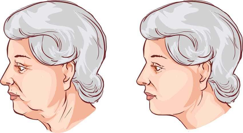 - Megereszkedett bőr és felesleges zsír a nyakon, ami kettős állat vagy “pulyka nyak” kialakulását eredményezheti.